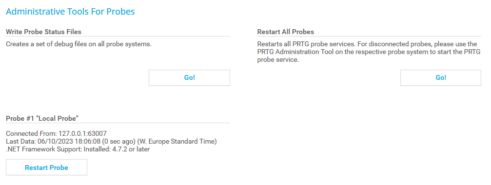 Create status files of all probes. PRTG writes status files for the local probe on the PRTG core server (in a cluster, on the cluster node you are logged in to) as well as for all classic remote probes. PRTG creates new files each time you click Go!.