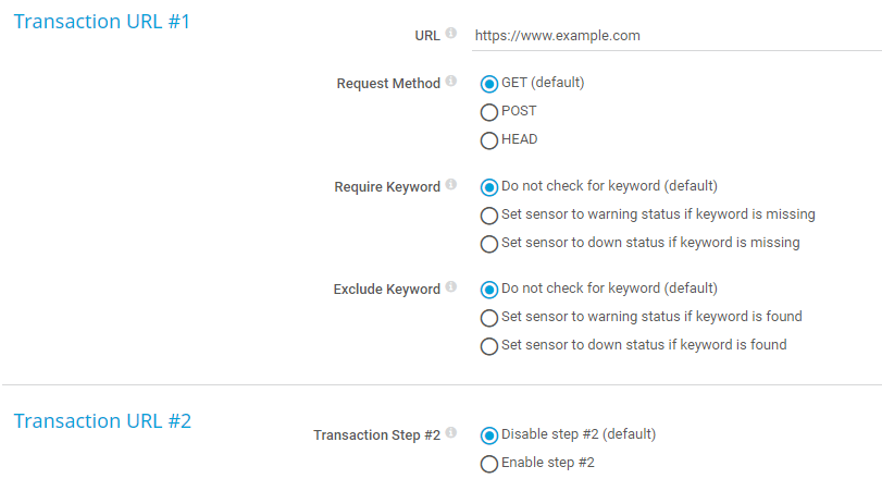 You can define up to 10 different transaction URLs, which are all called in a row. If the transaction can be completed, the sensor shows the Up status. Using this mechanism, you can set up extended monitoring with multiple URLs.
