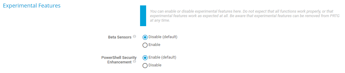 The operating methods of the experimental features might change at any time. Do not expect that all functions work properly, or that the experimental features work as expected at all. Be aware that Paessler might remove these features at any time.