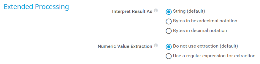 • Bytes in hexadecimal notation: Handle the result as bytes in hexadecimal notation. For example, select this option if you monitor MAC addresses.
